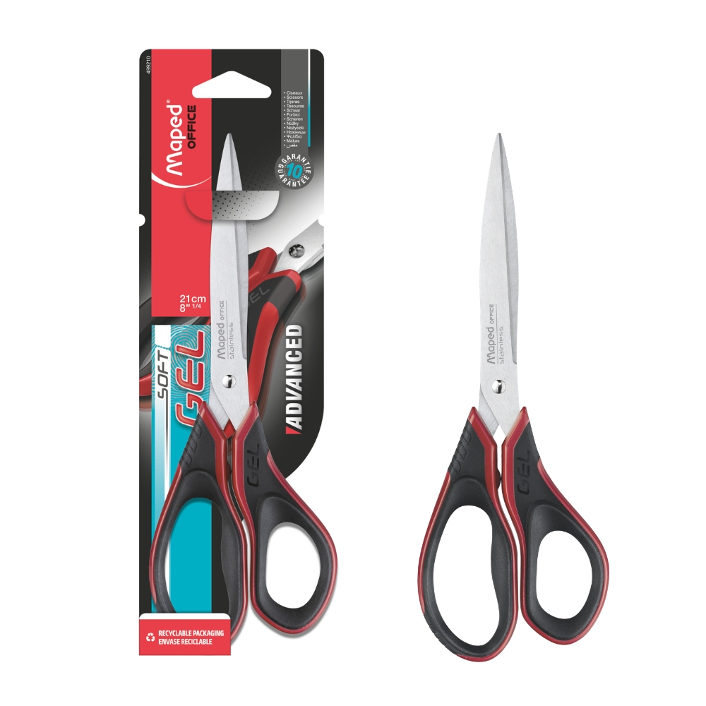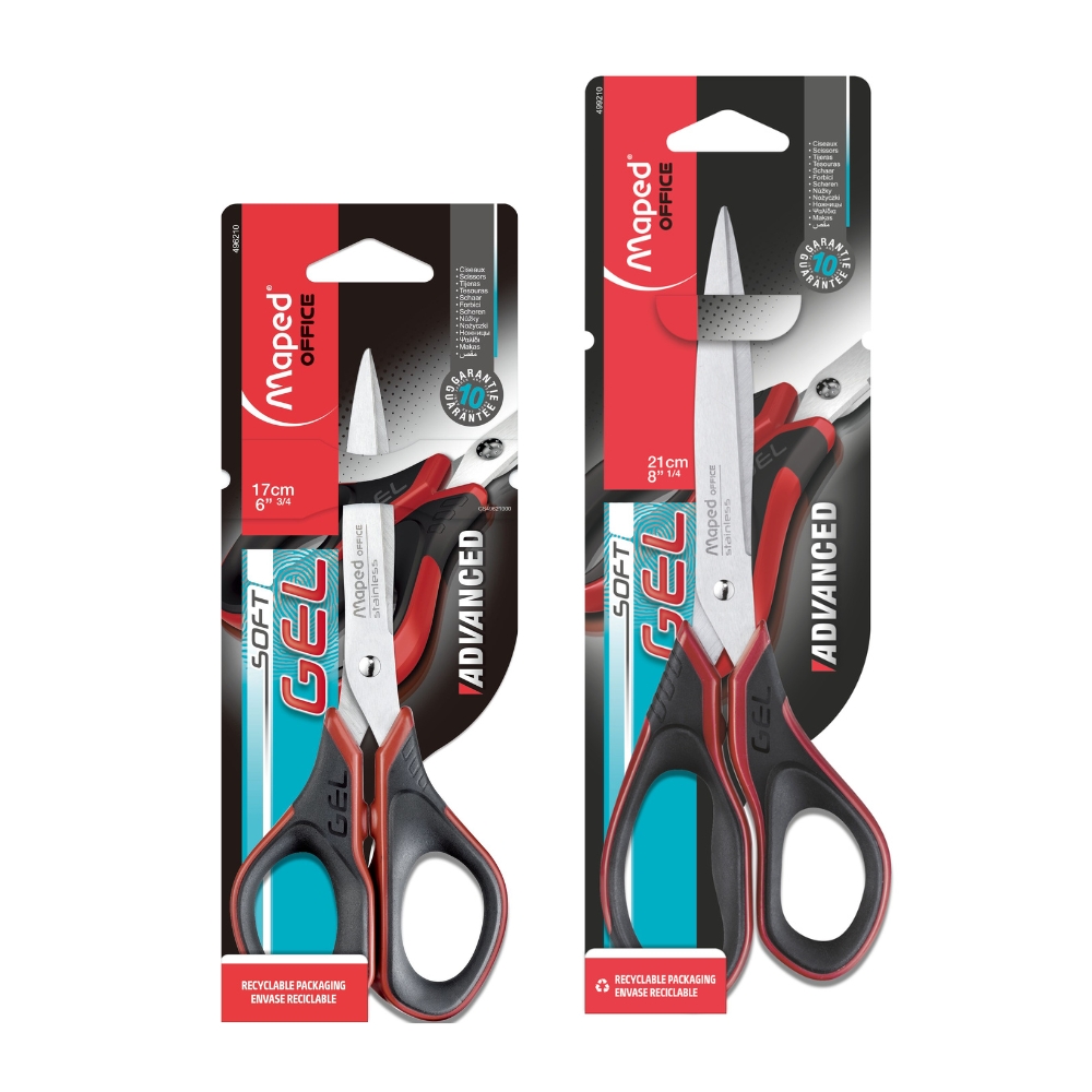 Kéo văn phòng Advanced Gel 17cm 21cm là dòng kéo Maped tập trung vào độ êm tay và độ chính xác khi cắt. Đây là “the most comfortable scissors” – nhờ tay cầm công thái học 3D và vật liệu gel siêu mềm giúp cầm chắc, dễ chịu, hạn chế cảm giác đau tay khi thao tác lâu.
